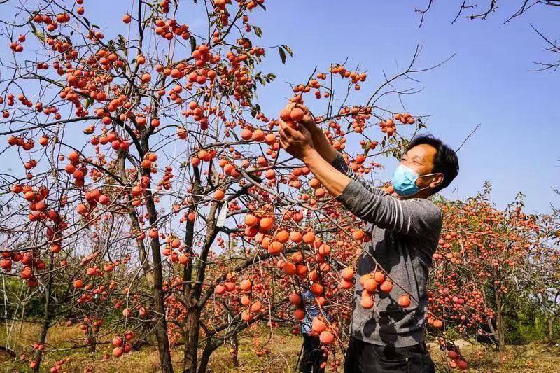 2022年10月底,驪山腳下,臨潼區(qū)代王街道山任村,紅彤彤的火晶柿子在霜降節(jié)氣來臨之際掛滿枝頭,群眾正在采摘(央廣網(wǎng)發(fā) 王三合 攝)