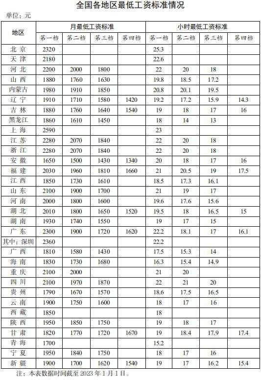 全國各地區(qū)最低工資標準情況(截至2023年1月1日),來自人社部網(wǎng)站