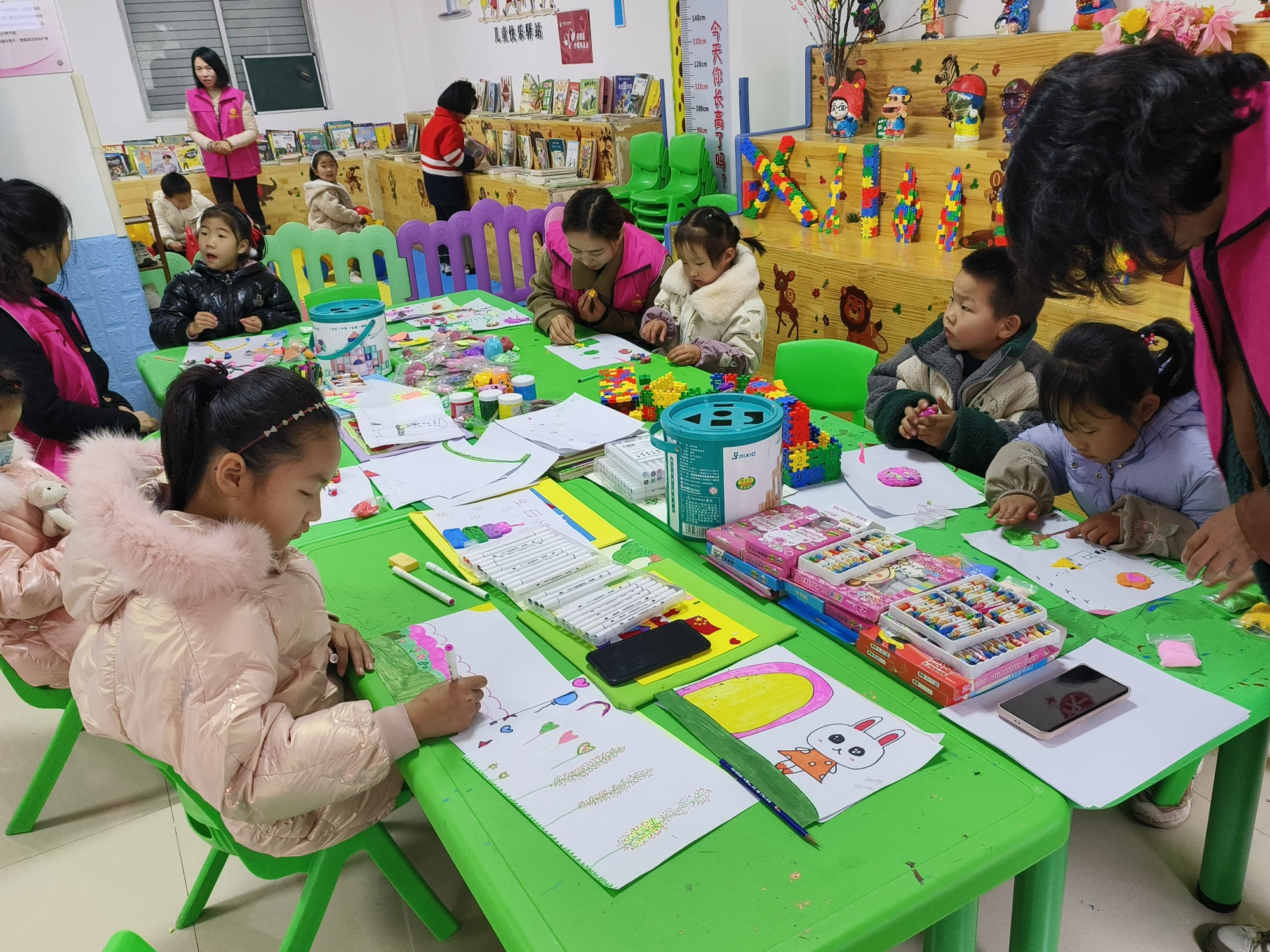 記者走進(jìn)婦女兒童之家,志愿者們正帶領(lǐng)一群小朋友,有的指導(dǎo)繪畫,有的講繪本故事,有的在陪孩子們玩玩具。“我是咱社區(qū)幼兒園的老師,自愿申請(qǐng)來(lái)到這里。我們這有14個(gè)志愿者,大家利用空閑時(shí)間來(lái)陪伴這些留守兒童。”志愿者黃顏筱介紹道,“一般放學(xué)后等兩個(gè)小時(shí)左右家長(zhǎng)們就都接走了。”