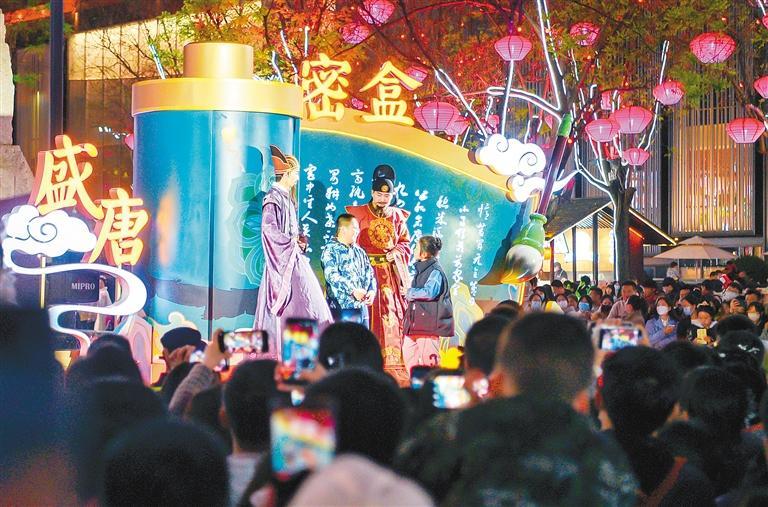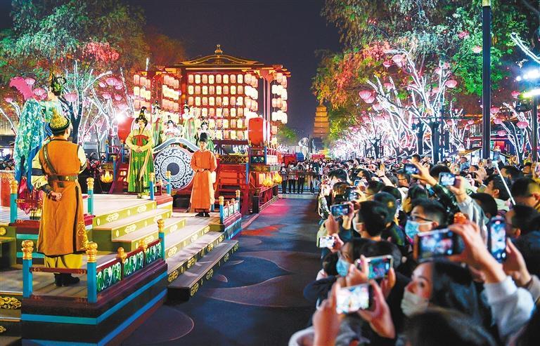 文化為旅游賦能,旅游因文化而有了靈魂。如果說大唐不夜城是西安盛唐文化的名片,那么大唐不夜城的演出則把盛唐文化真切地呈現在了人們的面前?!赌奚延鹨挛琛肥鞘⑻谱钊A麗的舞蹈,《花車斗彩》展示了大唐風采,《盛唐密盒》把生活過成了段子,《華燈太白》凝結了李白的詩情與不羈,“不倒翁小姐姐”巧笑倩兮,搖出了長安女子的溫柔……