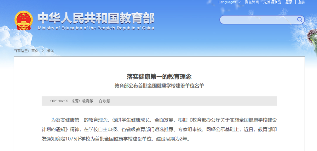 教育部公布首批全國健康學校建設單位名單