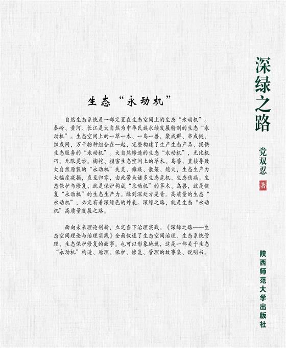 面向未來(lái)理論創(chuàng)新,立定當(dāng)下治理實(shí)踐?!渡罹G之路——生態(tài)空間理論與治理實(shí)踐》全面敘述了生態(tài)空間治理、生態(tài)系統(tǒng)管理、生態(tài)保護(hù)修復(fù)的故事。也可以形象地說(shuō),這是一部關(guān)于生態(tài)“永動(dòng)機(jī)”構(gòu)造、原理、保護(hù)、修復(fù)、管理的故事集、說(shuō)明書(shū)。