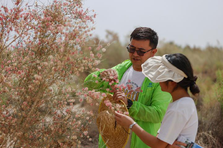 2023年6月12日,在中科院新疆生態(tài)與地理研究所策勒沙漠研究站天然試驗區(qū),買爾當和學生查看沙拐棗生長情況。新華社記者 郝昭 攝