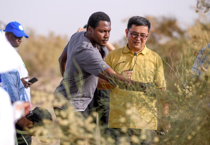 2023年6月13日,在中科院新疆生態(tài)與地理研究所策勒沙漠研究站天然實驗區(qū),中國科研人員買爾當(右一)為參加第二屆非洲綠色長城建設(shè)技術(shù)培訓(xùn)班的學員講解。新華社記者 王菲 攝