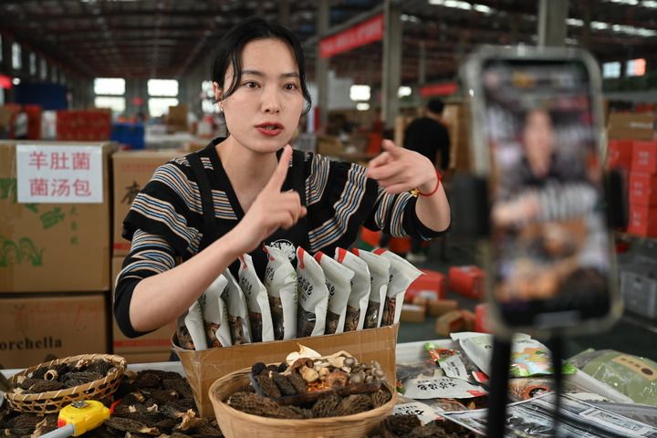 福建省寧德市近年來(lái)加大電商人才培育,推動(dòng)鄉(xiāng)村振興和經(jīng)濟(jì)高質(zhì)量發(fā)展。圖為不久前的一處農(nóng)產(chǎn)品深精加工車(chē)間內(nèi),當(dāng)?shù)匾幻娚讨鞑フ诮榻B羊肚菌產(chǎn)品。新華社記者 林善傳攝