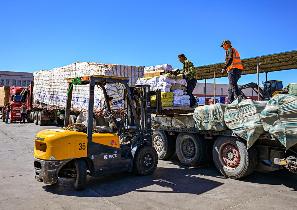 2023年6月11日,工人在二連浩特口岸旁的進(jìn)出口物流園區(qū)中裝載準(zhǔn)備出口的貨物。新華社記者 彭源 攝