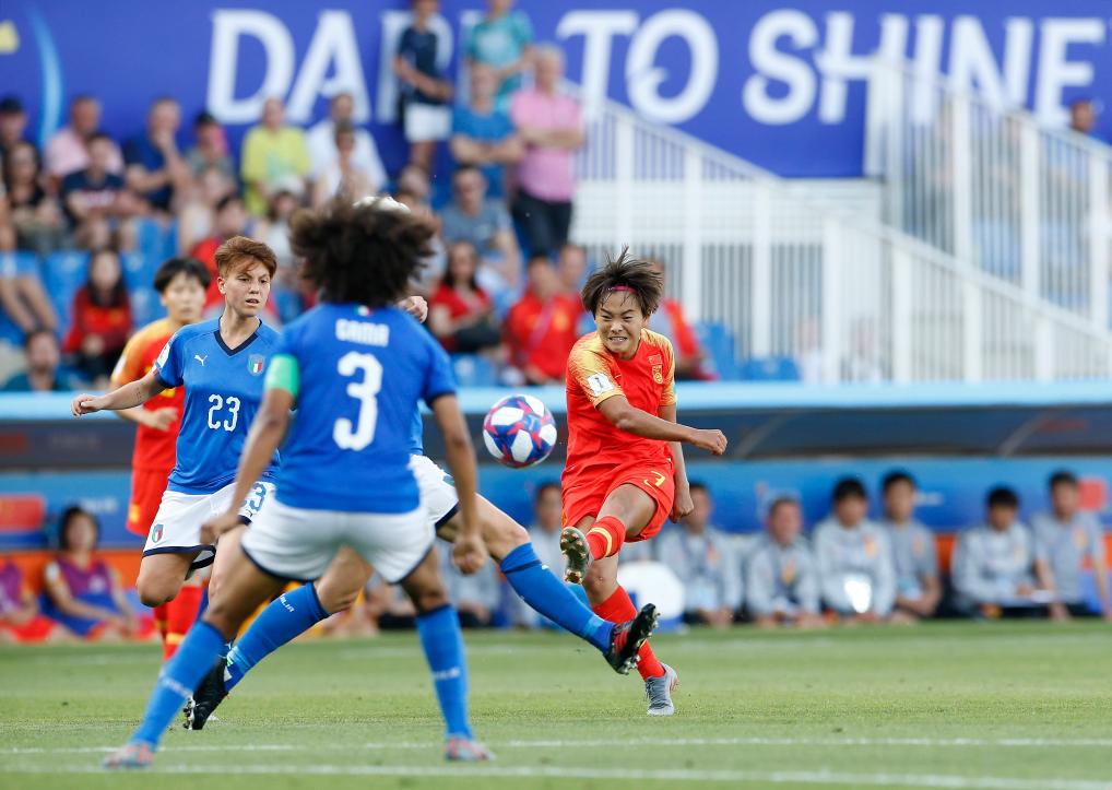 2019年6月25日,中國(guó)隊(duì)球員王霜(右一)在比賽中射門。當(dāng)日,在法國(guó)蒙彼利埃舉行的2019年國(guó)際足聯(lián)女足世界杯16強(qiáng)賽比賽中,中國(guó)隊(duì)以0比2不敵意大利隊(duì),無(wú)緣八強(qiáng)。新華社記者丁旭攝