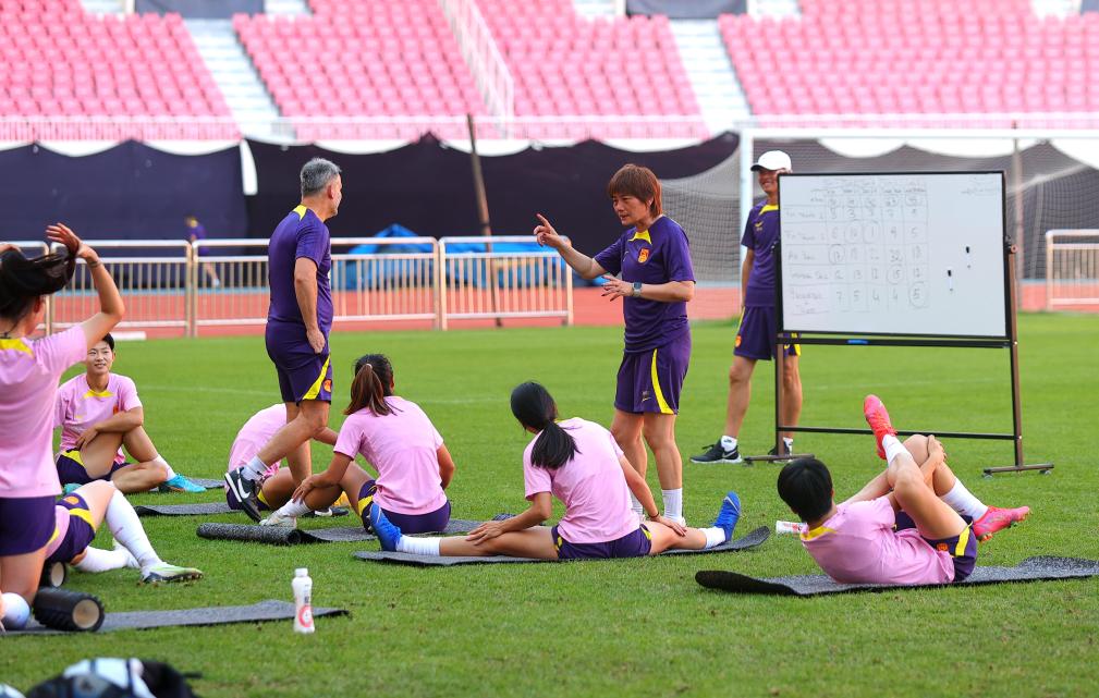 7月5日,中國(guó)女足主教練水慶霞(右三)點(diǎn)評(píng)訓(xùn)練情況。新華社記者丁旭攝