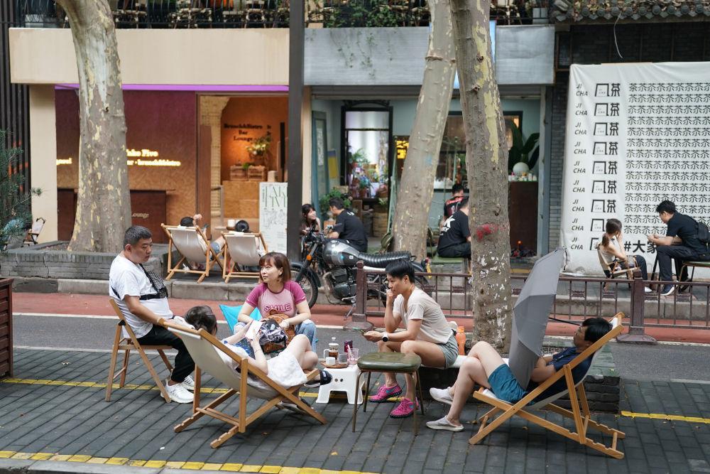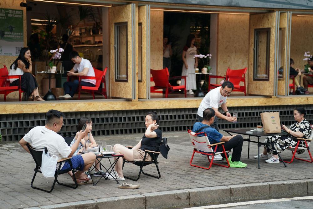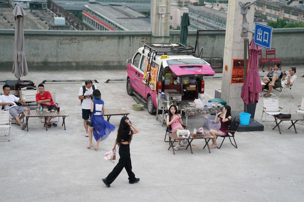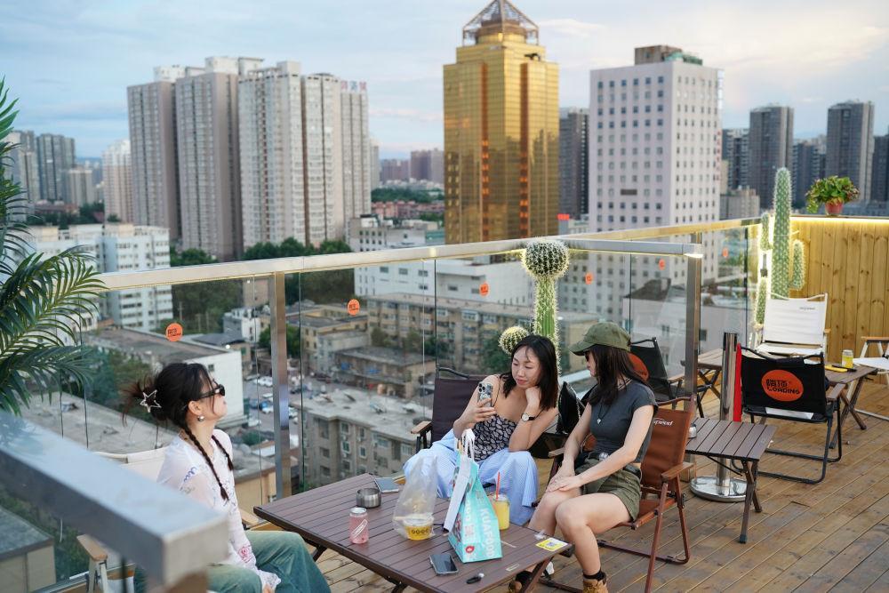 7月26日,年輕人在一棟由停車(chē)樓頂層改造而來(lái)的飲品店內(nèi)消費(fèi)休閑。新華社記者 邵瑞 攝