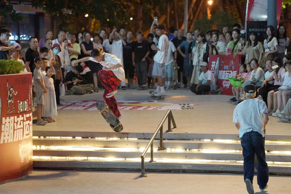 7月30日,滑板愛(ài)好者在西安市一商業(yè)街區(qū)進(jìn)行滑板表演有獎(jiǎng)競(jìng)賽活動(dòng)。新華社記者 邵瑞 攝