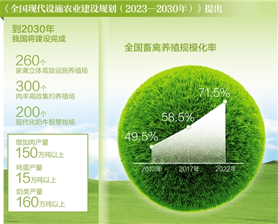規(guī)?;O施化養(yǎng)殖助推畜牧業(yè)綜合產(chǎn)能提升?!度珖F(xiàn)代設施農(nóng)業(yè)建設規(guī)劃(2023—2030年)》(以下簡稱《規(guī)劃》)提出,到2030年建設完成260個家禽立體高效設施養(yǎng)殖場、200個肉牛高效集約養(yǎng)殖場、300個肉羊高效集約養(yǎng)殖場和200個現(xiàn)代化奶牛智慧牧場,增加肉產(chǎn)量150萬噸以上、雞蛋產(chǎn)量15萬噸以上、奶類產(chǎn)量160萬噸以上,我國的肉蛋奶供應保障水平將進一步提高。