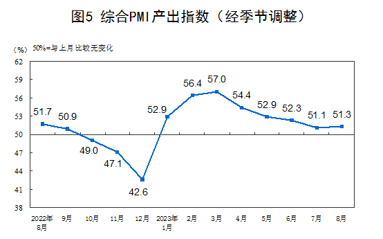8月份,綜合PMI產(chǎn)出指數(shù)為51.3%,比上月上升0.2個百分點,繼續(xù)保持在擴(kuò)張區(qū)間,表明我國企業(yè)生產(chǎn)經(jīng)營活動總體穩(wěn)定擴(kuò)張。