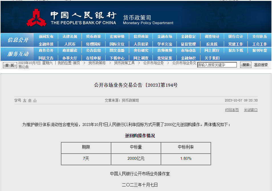 據(jù)中國人民銀行網(wǎng)站公告,10月7日,央行以利率招標(biāo)方式開展2000億元逆回購操作,期限為7天,中標(biāo)利率為1.80%,與此前持平。