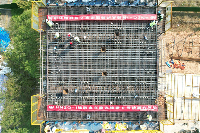 跨京滬高鐵立交特大橋位于滁河西岸,安徽省滁州市南譙區(qū)烏衣鎮(zhèn)和全椒縣十字鎮(zhèn)境內(nèi),總長17.5公里。其中跨永興路連續(xù)梁為三跨變截面箱梁,跨越滁州市南讓區(qū)永興路,橋跨位置對應(yīng)跨京滬高鐵立交特大橋180#墩至183#墩,全長177.7米,0#塊長度達12米。由于0#段內(nèi)預(yù)應(yīng)力筋布置復(fù)雜、非預(yù)應(yīng)力筋密集,要求一次澆筑成型,施工難度大。為保證施工質(zhì)量,此次澆筑總體以“統(tǒng)籌規(guī)劃、科學(xué)組織、重點先行、分段展開、均衡生產(chǎn)、標(biāo)準化作業(yè)、有序推進”為原則展開施工。