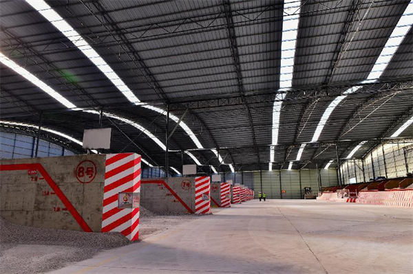 項目施工,拌和站建設(shè)必是首當(dāng)其沖。5、8標(biāo)拌和站建設(shè),大門劃分出分流道,使人車各行其道;設(shè)置保安室、門禁系統(tǒng),實行嚴(yán)格管里;劃分拌和作業(yè)區(qū)、材料堆放區(qū)及運(yùn)輸車輛停放區(qū),起到有序作業(yè);站區(qū)設(shè)置自動噴淋洗車池、廢水沉淀池,布設(shè)排水系統(tǒng);拌和站四周設(shè)置圍墻圍欄,安裝視頻監(jiān)控系統(tǒng),實行封閉式、可視式實時管理;水泥拌和樓主體全封包,上料倉加蓋雨棚,除上料這面外,其它三面圍閉,且料倉間擋板延伸至雨棚頂,徹底隔斷串料隱患。料倉配備自動識別噴霧除塵設(shè)備,有效防止粉塵擴(kuò)散,降低空氣污染;配備粗集料水洗設(shè)備,洗去微量的石粉和雜質(zhì),提高砂石的質(zhì)量。在此基礎(chǔ)上,兩家項目部各有創(chuàng)新亮點。