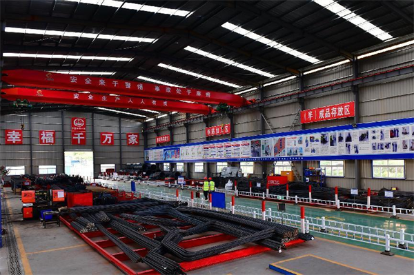 作為臨建標(biāo)準(zhǔn)化建設(shè)的重要標(biāo)志,桂鐘5、8標(biāo)段的鋼筋加工廠,廠房高度12米,作業(yè)場地平整、硬化。加工場內(nèi)醒目位置都設(shè)置工程公示牌、施工平面布置圖、安全生產(chǎn)牌、消防保衛(wèi)牌、管理人員名單及監(jiān)督電話牌、文明施工牌等明示標(biāo)志。加工廠內(nèi)按照功能設(shè)立了原材料堆放區(qū)、鋼筋下料區(qū)、加工制作區(qū)、鋼筋籠預(yù)拼接區(qū)、半成品堆放區(qū);還設(shè)置安裝了龍門數(shù)控切割機(jī)、全自動數(shù)控液壓鋼筋調(diào)直切斷機(jī)、鋼筋快速鋸床、數(shù)控鋼筋彎曲機(jī)、數(shù)控鋼筋調(diào)直機(jī)、數(shù)控鋼筋彎箍機(jī)、數(shù)字化工業(yè)焊接機(jī)器人、數(shù)控滾籠焊機(jī)、數(shù)控立式彎曲中心、全自動數(shù)控彎箍機(jī)、鋸切套絲打磨生產(chǎn)線等等機(jī)械化、數(shù)字化設(shè)備并懸掛著機(jī)械操作安全規(guī)定公示牌和設(shè)備標(biāo)示牌。這些工裝工藝標(biāo)準(zhǔn)化為項目部標(biāo)準(zhǔn)化建設(shè)賦能。