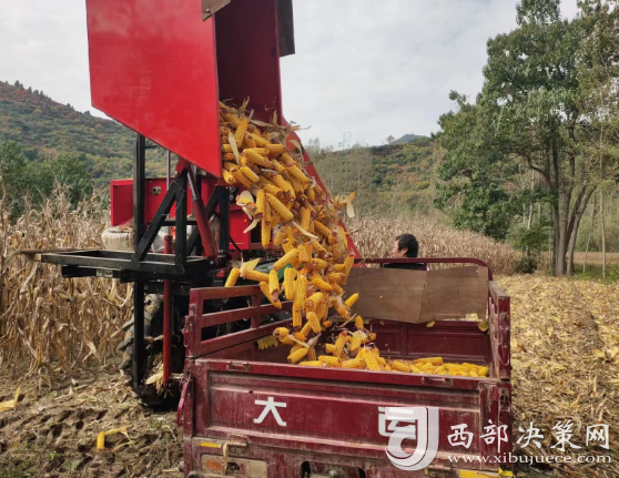 在西坡鎮(zhèn)三坪村的玉米田里,伴隨著機(jī)器轟鳴聲,聯(lián)合收割機(jī)和運(yùn)輸車輛來回穿梭,將成排的玉米植株連桿帶穗同時(shí)卷入“腹”中,摘棒、秸稈粉碎還田一氣呵成,不一會(huì)兒,黃澄澄的玉米傾瀉而下,很快便裝滿了運(yùn)輸車,將“豐收在望”變成了“顆粒滿倉”。