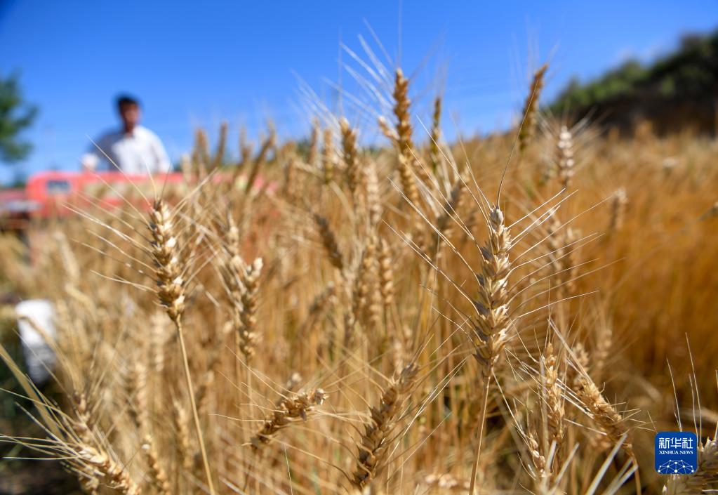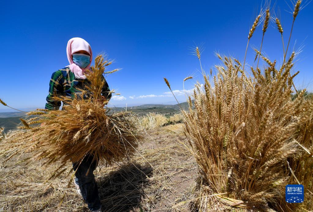7月3日,寧夏固原市原州區(qū)炭山鄉(xiāng)炭山村村民將收割的冬小麥打捆。新華社記者 馮開(kāi)華 攝