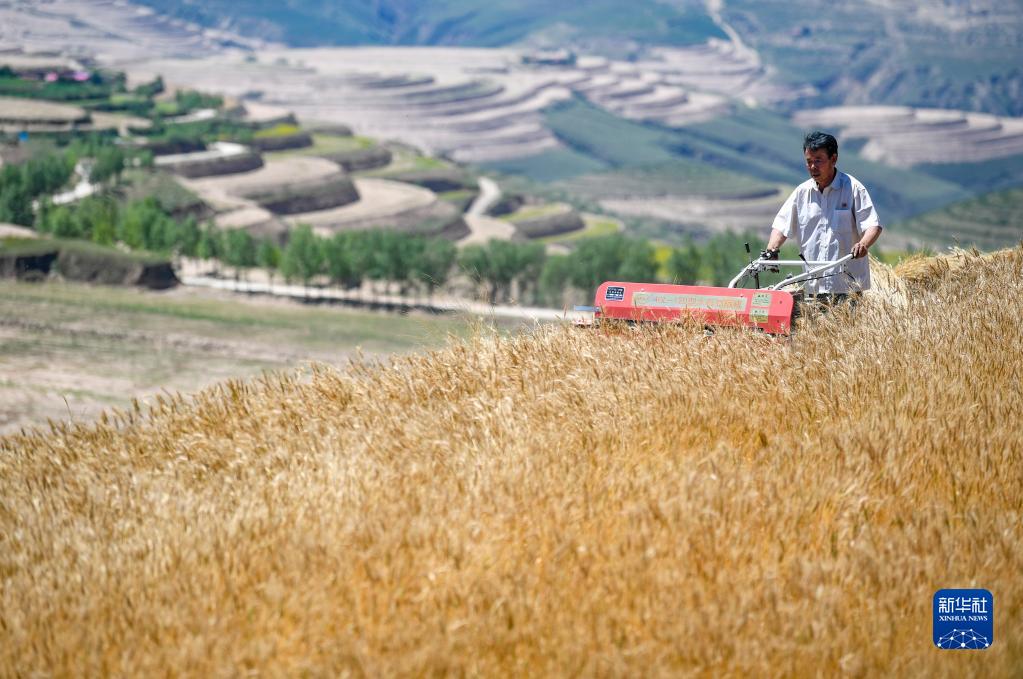 7月3日,寧夏固原市原州區(qū)炭山鄉(xiāng)炭山村村民操作小型割曬機(jī)收割冬小麥。新華社記者 馮開(kāi)華 攝