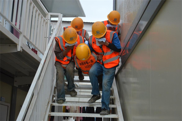 本次演練模擬施工現(xiàn)場(chǎng)電焊作業(yè)不慎點(diǎn)燃易燃材料擠塑板引發(fā)起火,引燃旁邊管理人員宿舍,導(dǎo)致一名人員疏散轉(zhuǎn)移不及時(shí)被困。演練現(xiàn)場(chǎng)設(shè)置了現(xiàn)場(chǎng)搶險(xiǎn)、醫(yī)療救護(hù)、技術(shù)保障、物資設(shè)備保障、安全警戒、后勤保障6個(gè)應(yīng)急小組。隨著總指揮一聲令下,演練人員立即組織人員緊急疏散,對(duì)被圍困的二樓作業(yè)人員進(jìn)行救援,同時(shí)組織人員進(jìn)行滅火,參演人員按照既定路線有序逃生,安全到達(dá)指定地點(diǎn)。同時(shí)邀請(qǐng)消防支隊(duì)講解常用的消防器材及滅火設(shè)施。