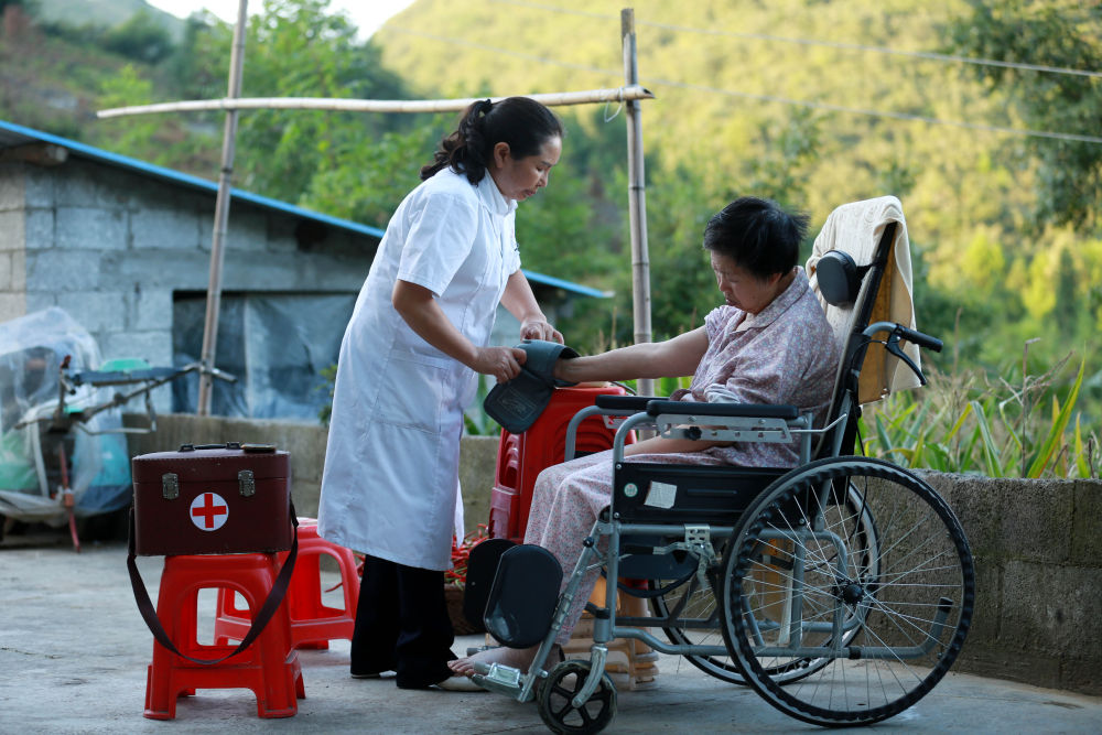 ↑貴州省黔南布依族苗族自治州貴定縣云霧鎮(zhèn)擺谷村,村醫(yī)羅海香(左)為一名行動不便的村民測量血壓(8月16日攝)。