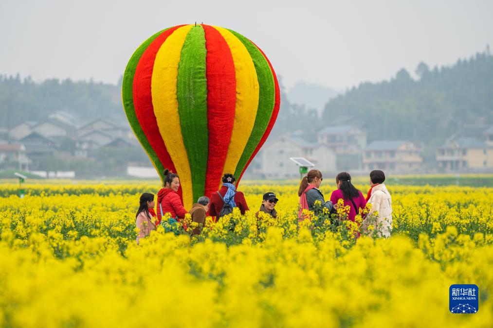 這是游客們在湖南省懷化市會同縣堡子鎮(zhèn)萬畝油菜花海觀光、打卡(2023年3月1日攝)。新華社發(fā)(張鐳攝)