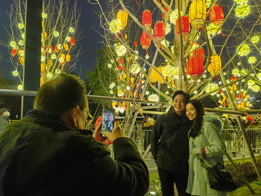 2023年12月30日,人們?cè)谏虾T@商城觀燈拍照。新華社記者 劉穎 攝