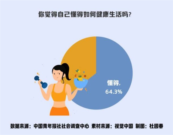 調(diào)查顯示,64.3%的受訪青年認(rèn)為自己懂健康生活,35.7%的受訪青年表示“不懂”。進(jìn)一步分析顯示,受訪青年所在城市級別越高,認(rèn)為自己懂健康生活的比例越高,一線城市受訪青年的比例最高,為71.6%;上班族認(rèn)為自己懂健康生活的比例(65.8%)略高于在校大學(xué)生(64.6%);隨著年齡的增長,受訪青年認(rèn)為自己懂健康生活的比例越高,受訪85后最高,為67.2%,00后相對最低,為61.2%。