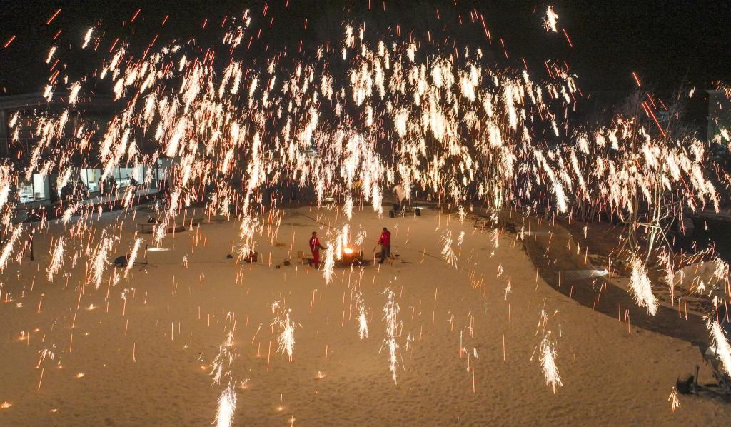 1月13日,民間藝人在河北省承德市興隆縣一景區(qū)為游客表演“打樹花”(無人機照片)。新華社發(fā)(劉滿倉 攝)