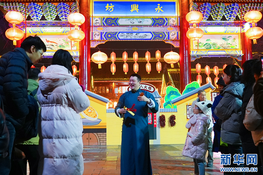 在西安永興坊——陜西非遺文化特色街區(qū),今年30歲的陜派相聲演員張浩哲,給游客們表演國家級非遺陜西快板。新華網(wǎng) 楊喜龍 攝