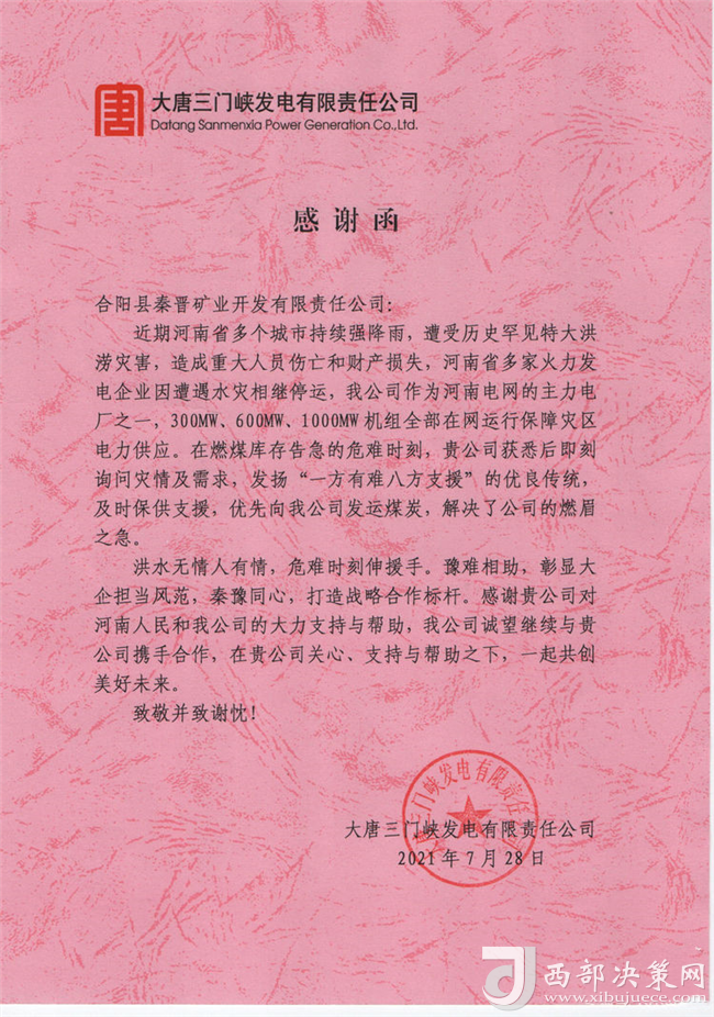 西部決策網(wǎng)訊 7月,受強(qiáng)對(duì)流天氣的影響,河南省多個(gè)城市持續(xù)遭遇強(qiáng)降雨,遭受了歷史罕見(jiàn)的特大洪澇災(zāi)害,給河南人民的生命財(cái)產(chǎn)造成嚴(yán)重的損失,多家火力發(fā)電企業(yè)因遭遇水災(zāi)相繼停運(yùn)。陜西秦晉礦業(yè)集團(tuán)公司聞?dòng)?,即刻與運(yùn)輸距離相對(duì)較近的大唐三門(mén)峽發(fā)電有限責(zé)任公司取得聯(lián)系,詢(xún)問(wèn)災(zāi)情及需求,當(dāng)獲悉發(fā)電燃煤庫(kù)存告急的危難時(shí)刻,秦晉集團(tuán)在燃煤緊缺的情況下,克服重重困難,急災(zāi)區(qū)人民所急,緊急向三門(mén)峽發(fā)電有限公司發(fā)運(yùn)燃煤3萬(wàn)余噸,解決了燃眉之急,確保了發(fā)電機(jī)組全部在網(wǎng)運(yùn)行,保障了災(zāi)區(qū)人民的電力供應(yīng),為災(zāi)區(qū)人民提供了及時(shí)的保供支援。